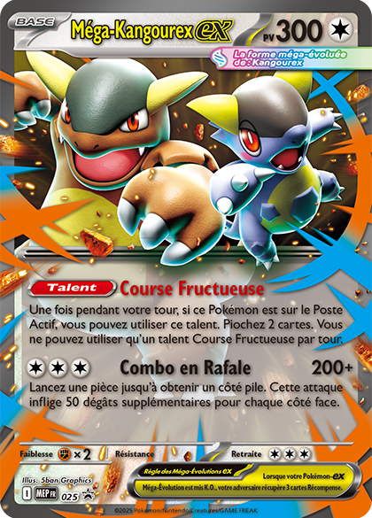 Lancez un Combo en Rafale avec Méga-Kangourex-ex ! La Méga-Évolution transforme le petit de Kangourex en une véritable force de la nature. Les deux Pokémon combinent leurs pouvoirs et deviennent Méga-Kangourex-ex. Piochez des cartes supplémentaires avec Course Fructueuse, puis utilisez Combo en Rafale et lancez des pièces pour essayer d’infliger plus de dégâts. Faites équipe avec Méga-Kangourex-ex en tant que carte promo brillante pour le jeu et en tant que carte lenticulaire grand format pour votre collection. Ouvrez ensuite les quatre boosters pour trouver d’autres superbes cartes !